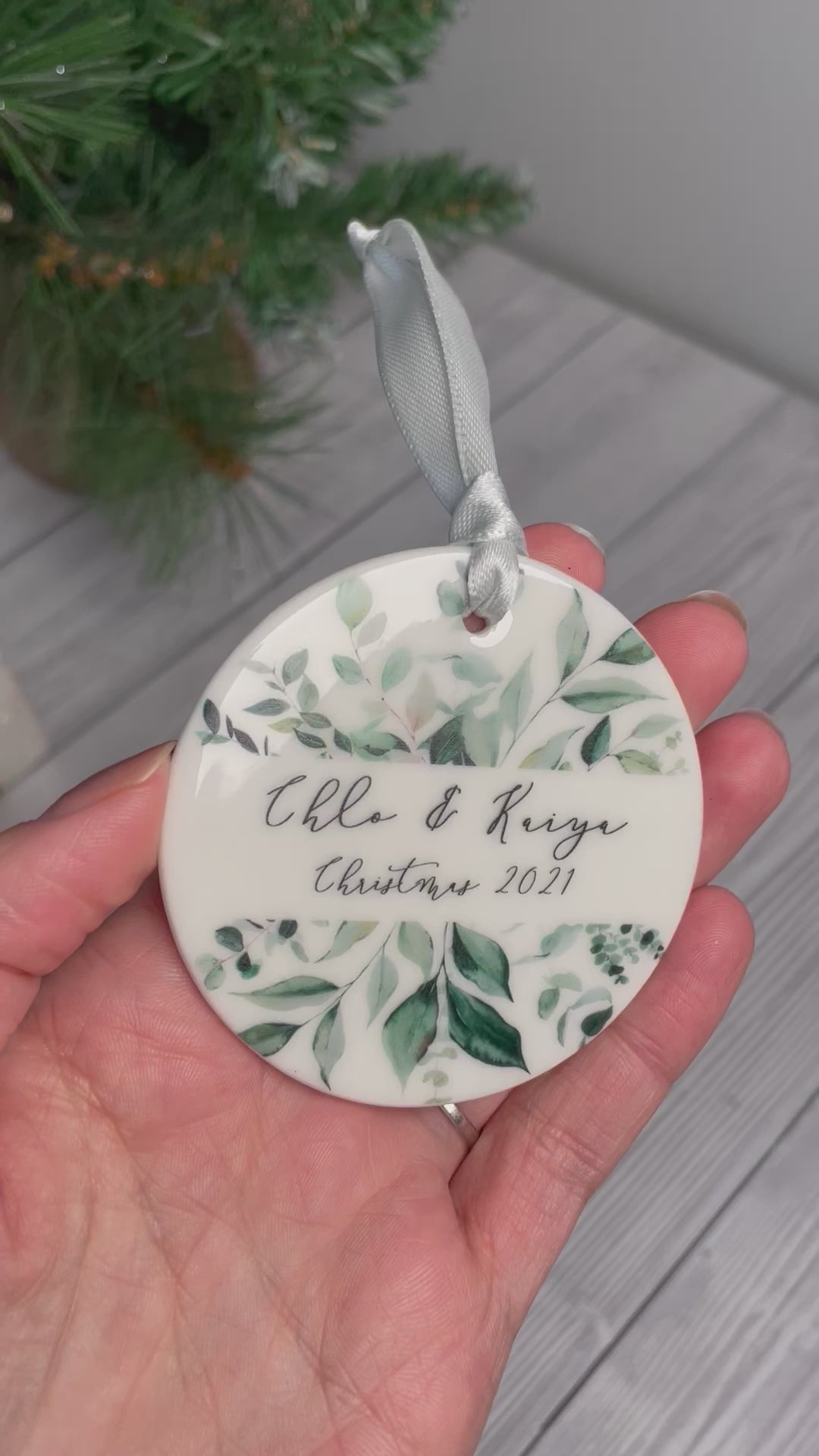 Ceramic Bauble with a greenery design and text of your choice printed on to it.