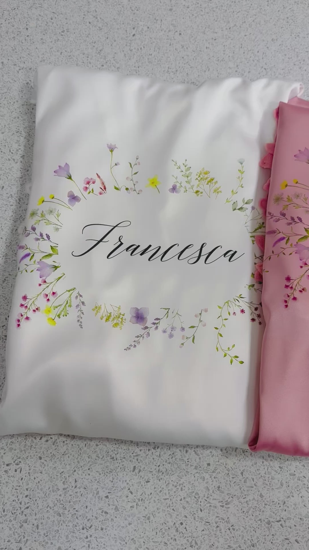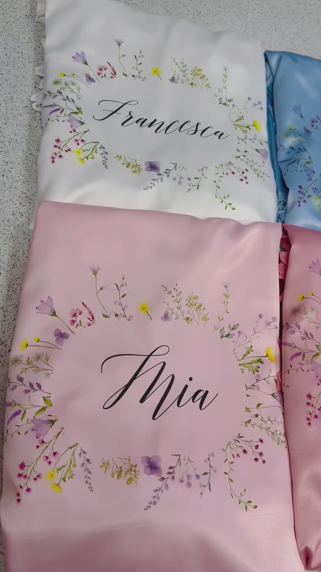 A stunning custom bride robe with a soft thick matt silk lace dressing gown. It has a beautiful wildflower design to show the elegance of you and your bridesmaid.